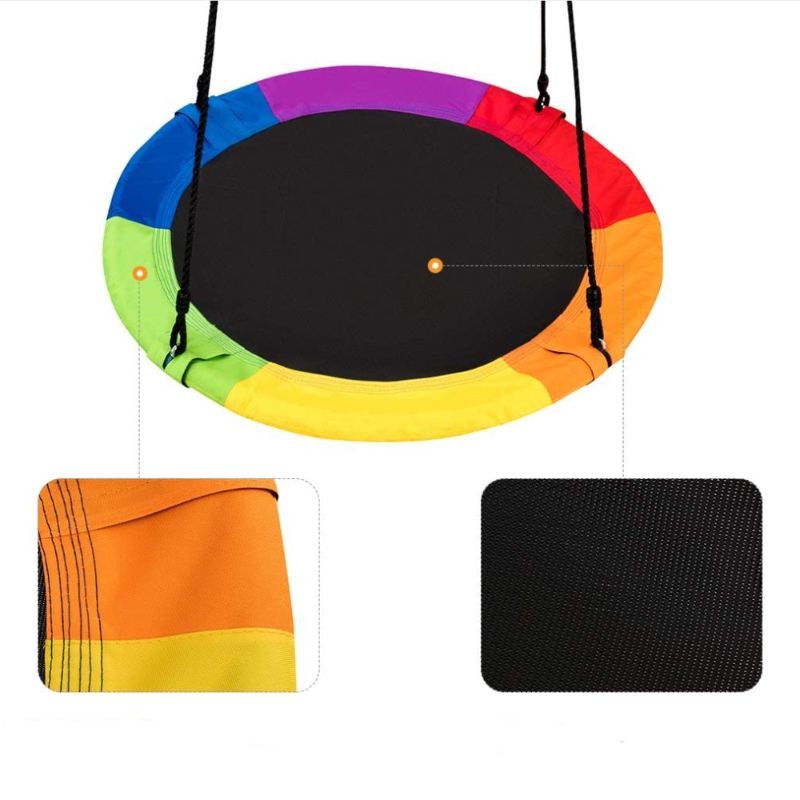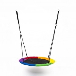 Okrugla ljuljaška šarenog dezena,prečnika 100cm. Materijal izrade: konstrukcija od metalnih cevi obloženim gumom 25 x1 mm. Prilagodljivo uže od 1,4 metra do 1,9 metra. Dozvoljeno opterećenje ljuljaške je maksimalno do 100 kg.